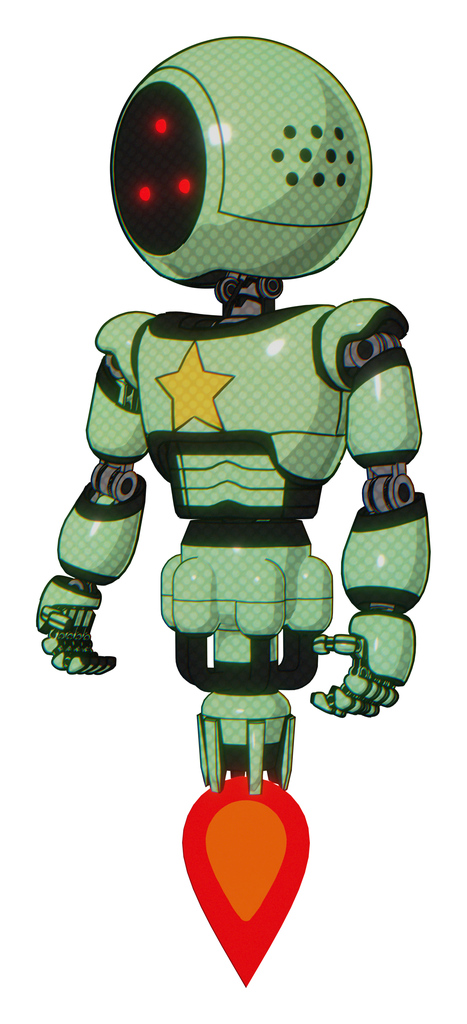 Mech containing three led eyes round head and light chest exoshielding and yellow star and jet propulsion. Green tint toon. Standing looking right restful pose.