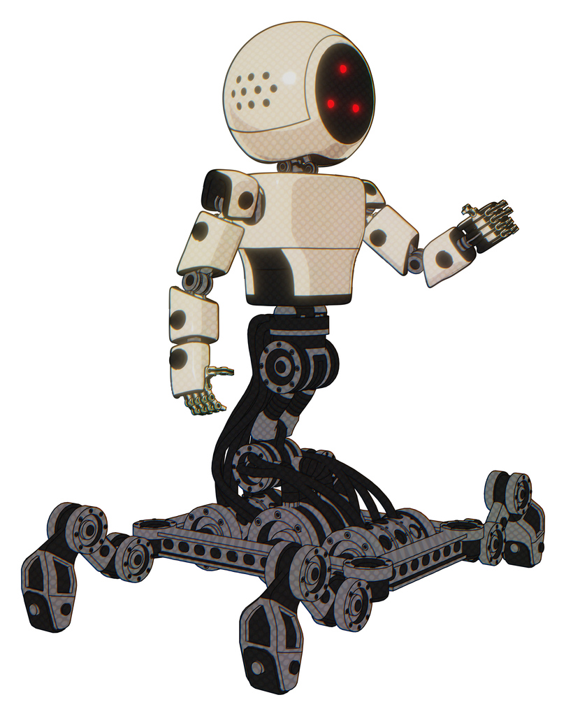 Cyborg containing three led eyes round head and light chest exoshielding and prototype exoplate chest and insect walker legs. Off white toon. Interacting.