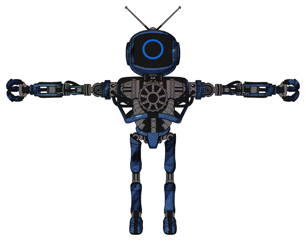 Automaton containing digital display head and circle face and retro antennas and heavy upper chest and no chest plating and ultralight foot exosuit. Grunge dark blue. T-pose.