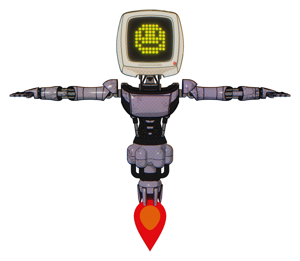 Robot containing old computer monitor and yellow happy face display and light chest exoshielding and ultralight chest exosuit and jet propulsion. Matted pink metal. T-pose.