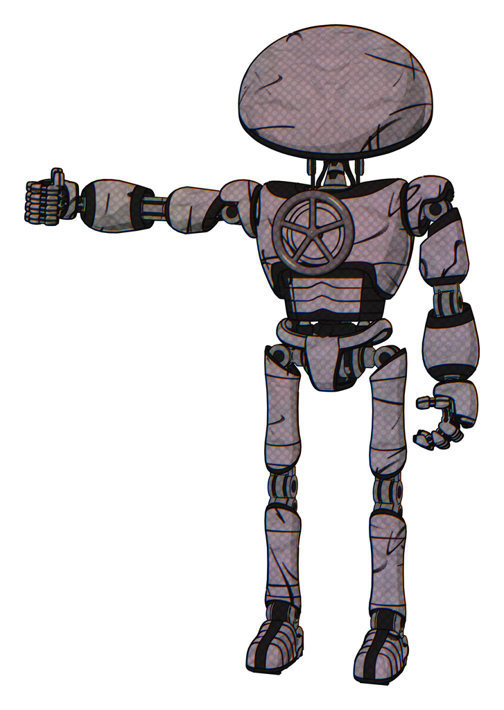 Robot containing dome head and light chest exoshielding and chest valve crank and ultralight foot exosuit. Dark sketch doodle. Arm out holding invisible object..