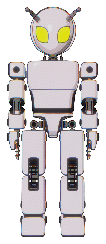 Droid containing grey alien style head and yellow eyes and bug antennas and light chest exoshielding and prototype exoplate chest and prototype exoplate legs. White halftone toon. Front view.