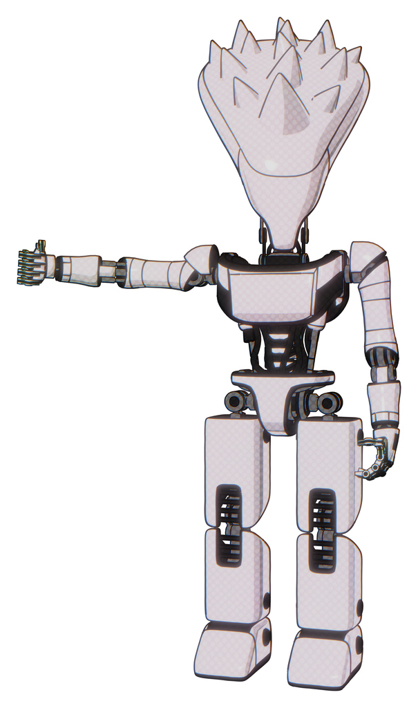 Bot containing flat elongated skull head and spikes, and light chest exoshielding and ultralight chest exosuit and prototype exoplate legs. White halftone toon. Arm out holding invisible object..