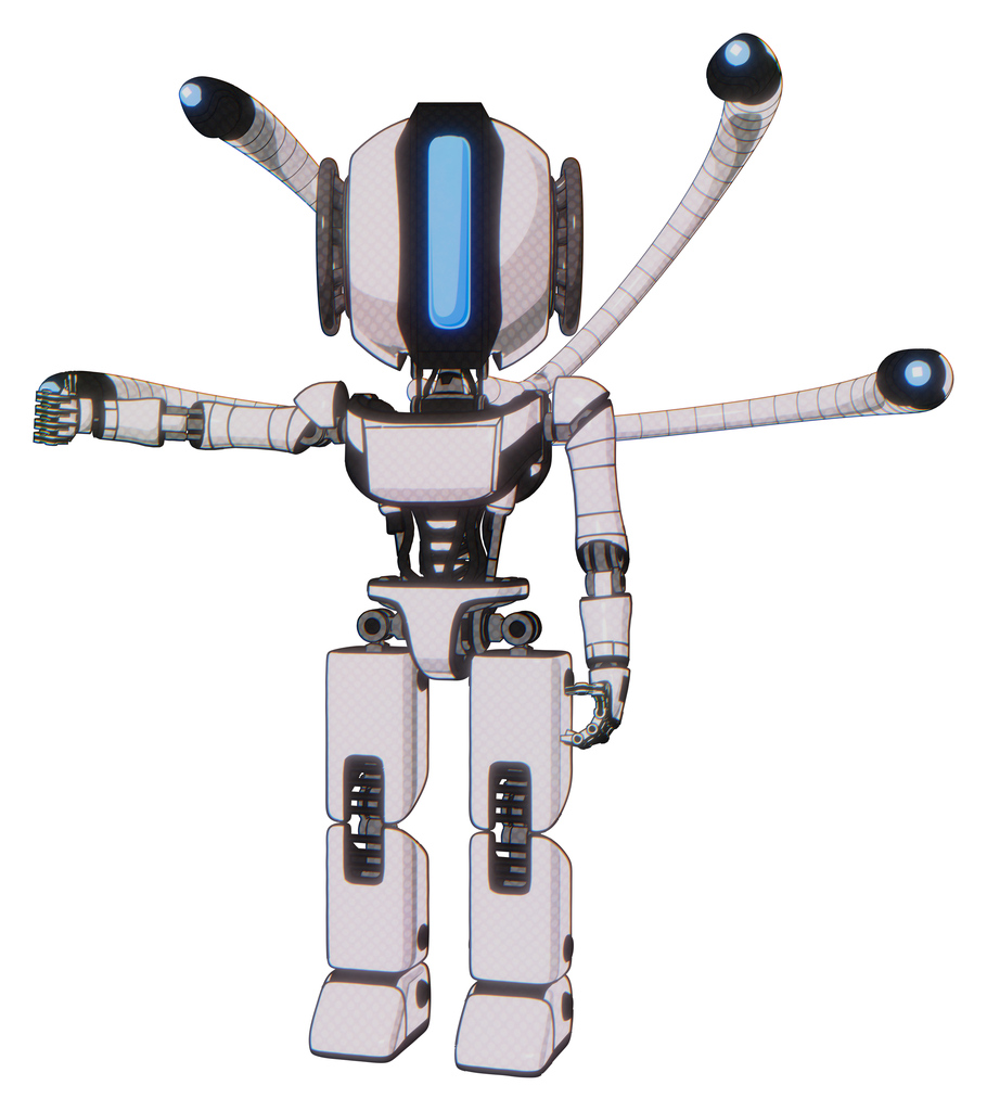 Bot containing elements: round head, large vertical visor, light chest exoshielding, ultralight chest exosuit, blue-eye cam cable tentacles, prototype exoplate legs. Material: White halftone toon.