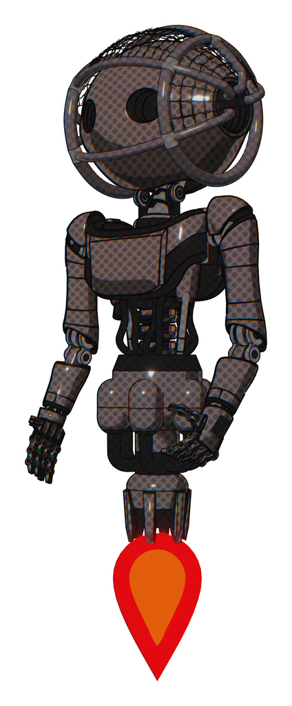 Cyborg containing oval wide head and barbed wire cage helmet and light chest exoshielding and ultralight chest exosuit and jet propulsion. Light brown. Facing right view.