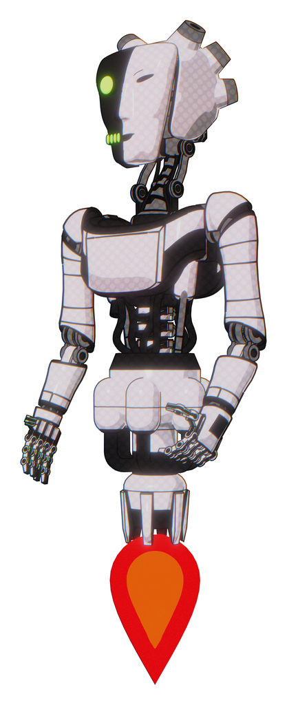 Cyborg containing humanoid face mask and two-face black white mask and light chest exoshielding and ultralight chest exosuit and jet propulsion. White halftone toon. Facing right view.