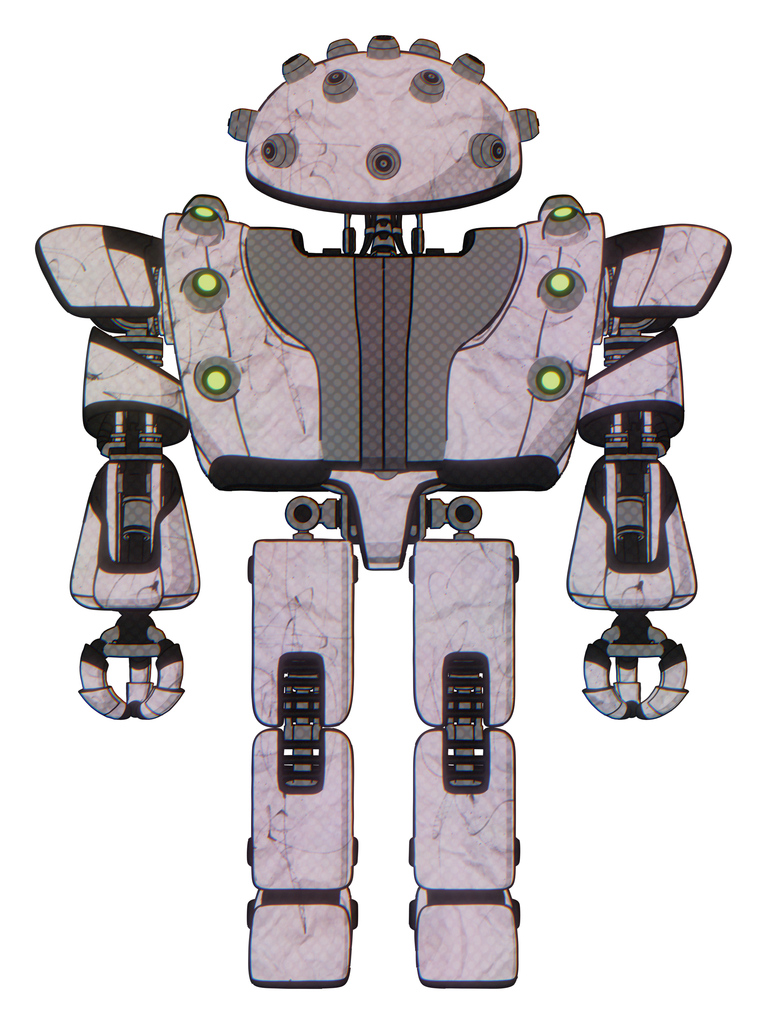 Robot containing plughead dome design and heavy upper chest and heavy mech chest and green cable sockets array and prototype exoplate legs. Sketch pad light lines. Front view.