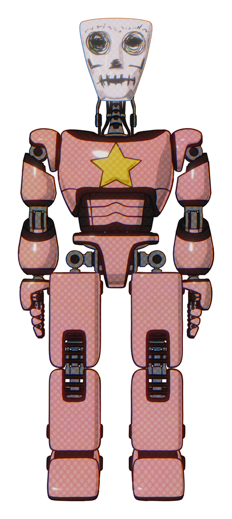 Mech containing humanoid face mask and skeleton war paint and light chest exoshielding and yellow star and prototype exoplate legs. Toon pink tint. Front view.