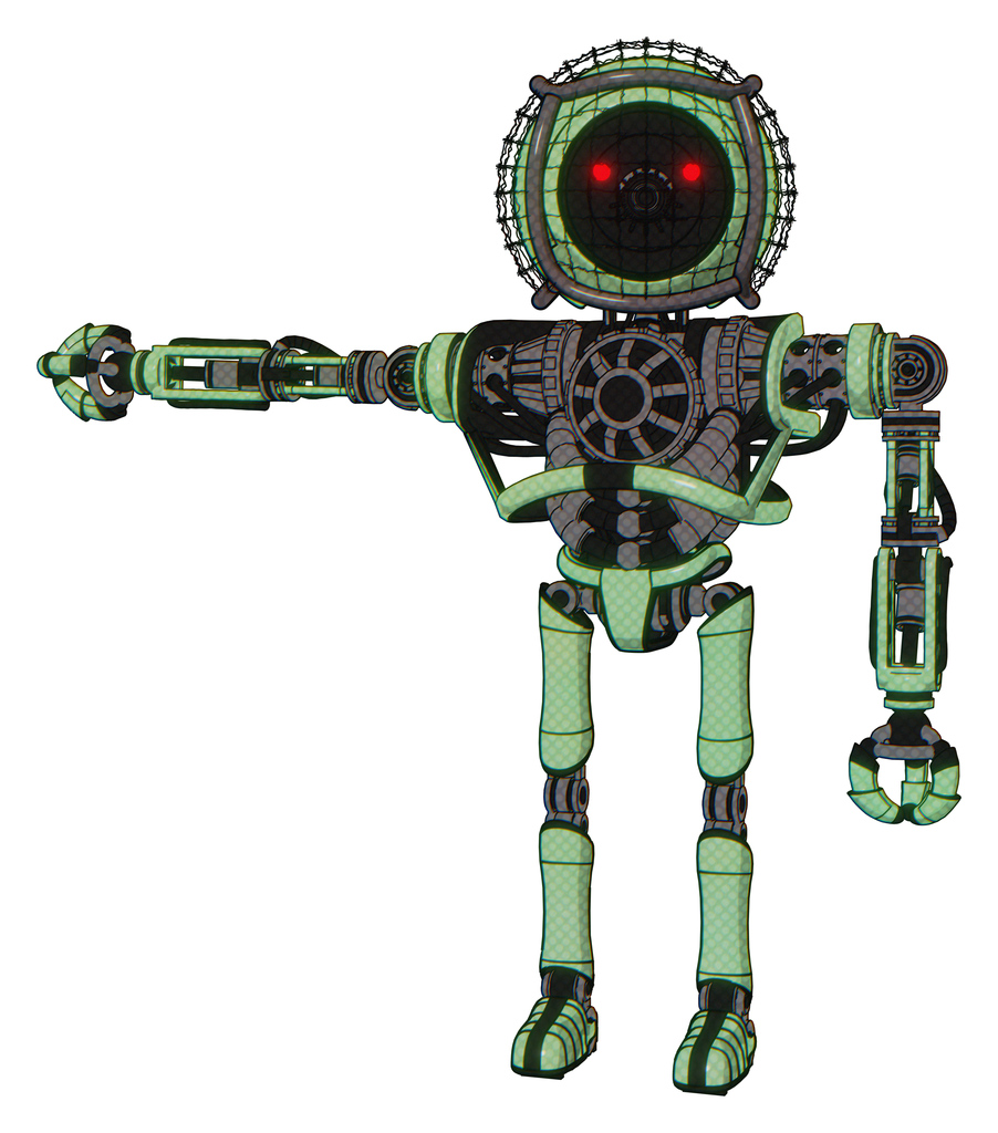Robot containing round barbed wire round head and heavy upper chest and no chest plating and ultralight foot exosuit. Green tint toon. Arm out holding invisible object..