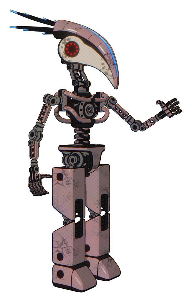 Robot containing bird skull head and red led circle eyes and head shield design and light chest exoshielding and no chest plating and prototype exoplate legs. Powder pink metal. Interacting.