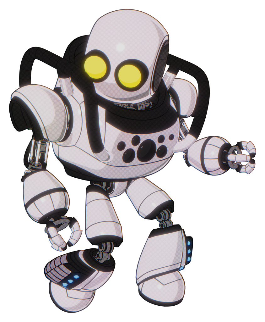 Droid containing round head and large yellow eyes and heavy upper chest and chest compound eyes and light leg exoshielding and megneto-hovers foot mod. White halftone toon. Fight or defense pose..