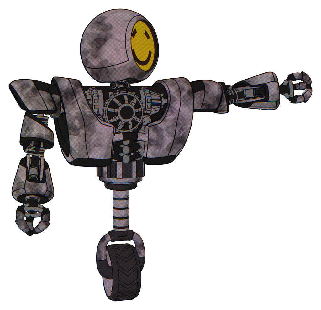 Robot containing round head yellow happy face and heavy upper chest and heavy mech chest and unicycle wheel. Sketch pad cloudy smudges. Pointing left or pushing a button..