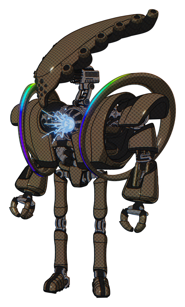 Robot containing flat elongated skull head and heavy upper chest and heavy mech chest and spectrum fusion core chest and ultralight foot exosuit. Light brown halftone.