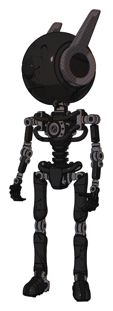 Robot containing elements: round head, large cyclops eye, head winglets, light chest exoshielding, no chest plating, ultralight foot exosuit. Material: Toon black scribbles sketch.