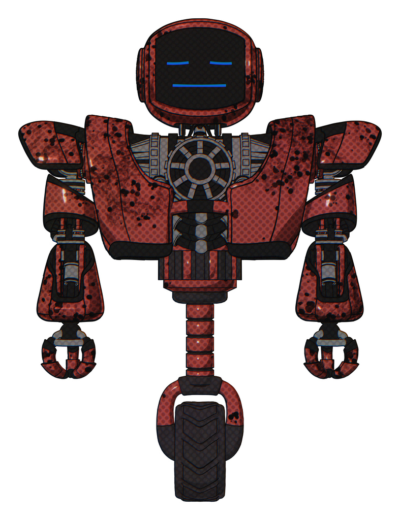 Mech containing digital display head and sleeping face and heavy upper chest and heavy mech chest and unicycle wheel. Grunge matted orange. Front view.