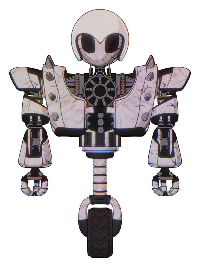 Robot containing grey alien style head and black eyes and helmet and heavy upper chest and heavy mech chest and shoulder spikes and unicycle wheel. Sketch pad doodle lines. Front view.