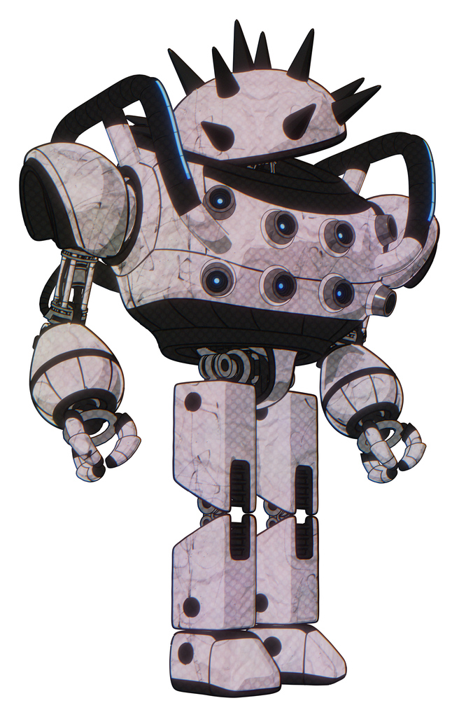 Bot containing thorny domehead design and heavy upper chest and chest energy sockets and blue strip lights and prototype exoplate legs. Sketch pad light lines. Hero pose.