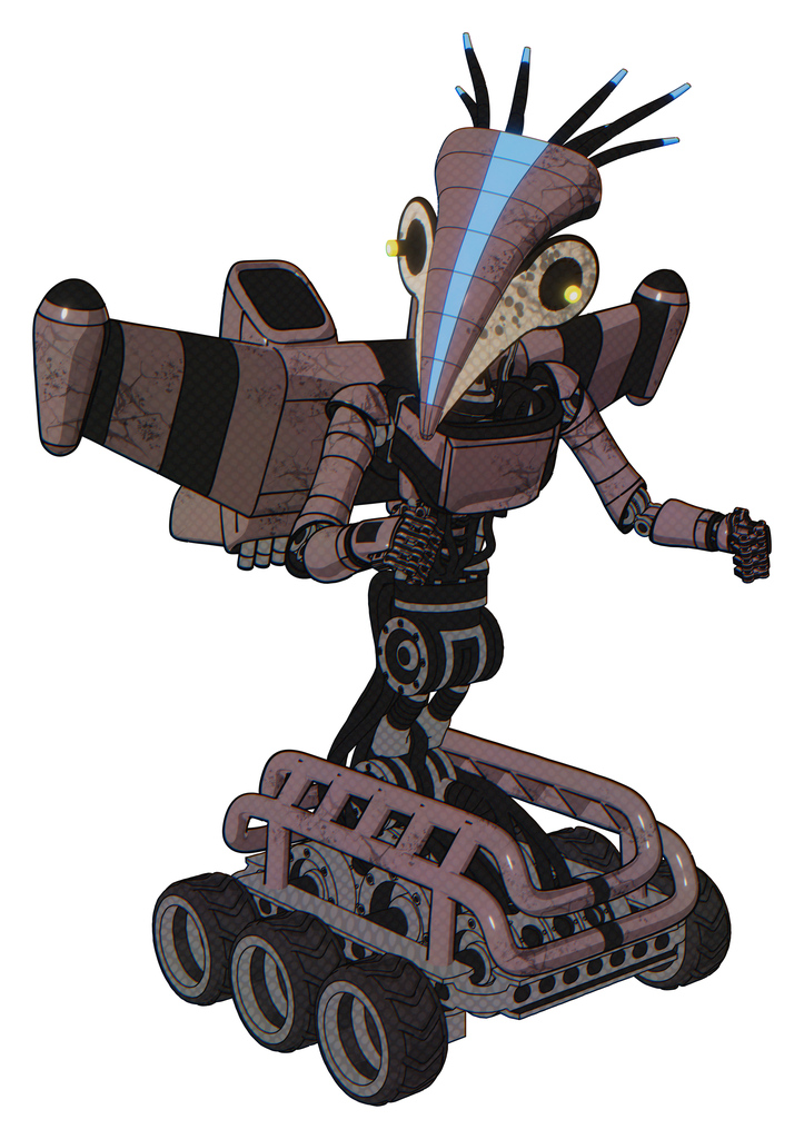 Mech containing bird skull head and yellow led protruding eyes and head shield design and light chest exoshielding and ultralight chest exosuit and stellar jet wing rocket pack and six-wheeler base.