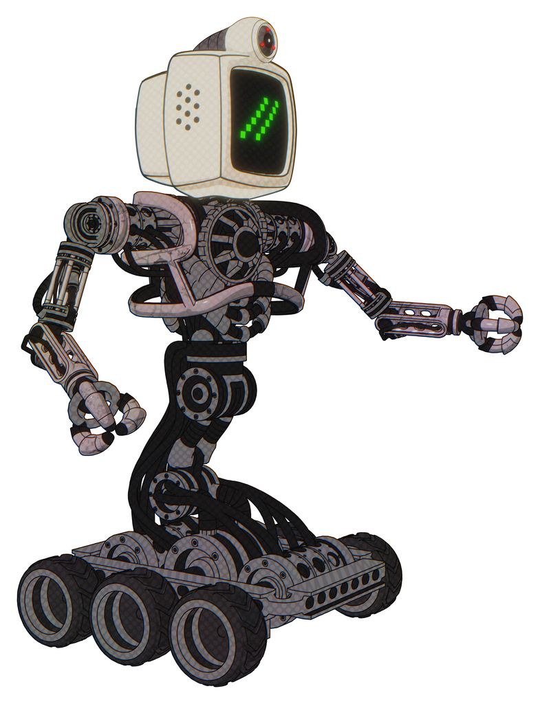 Cyborg containing old computer monitor and double backslash pixel design and retro-futuristic webcam and heavy upper chest and no chest plating and six-wheeler base. Gray metal. Interacting.