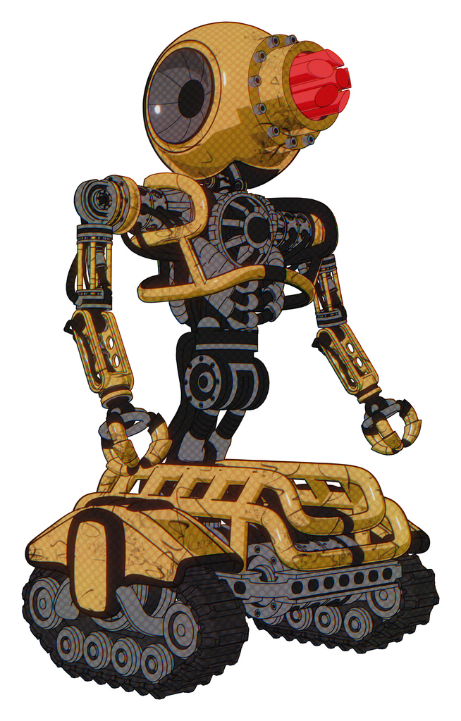 Robot containing round head and red laser crystal array and heavy upper chest and no chest plating and tank tracks. Construction yellow halftone. Facing left view.