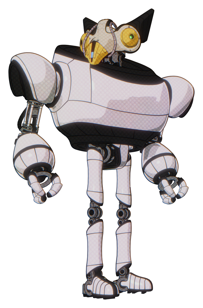 Bot containing bird skull head and brass steampunk eyes and robobeak design and heavy upper chest and ultralight foot exosuit. White halftone toon. Hero pose.