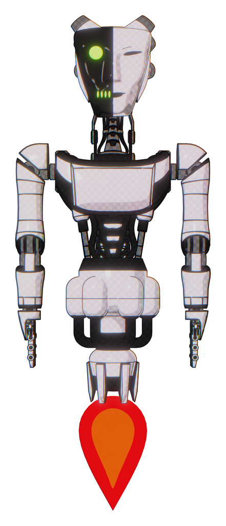 Cyborg containing humanoid face mask and two-face black white mask and light chest exoshielding and ultralight chest exosuit and jet propulsion. White halftone toon. Front view.