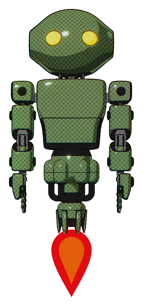 Bot containing oval wide head and yellow eyes and light chest exoshielding and prototype exoplate chest and jet propulsion. Grass green. Front view.