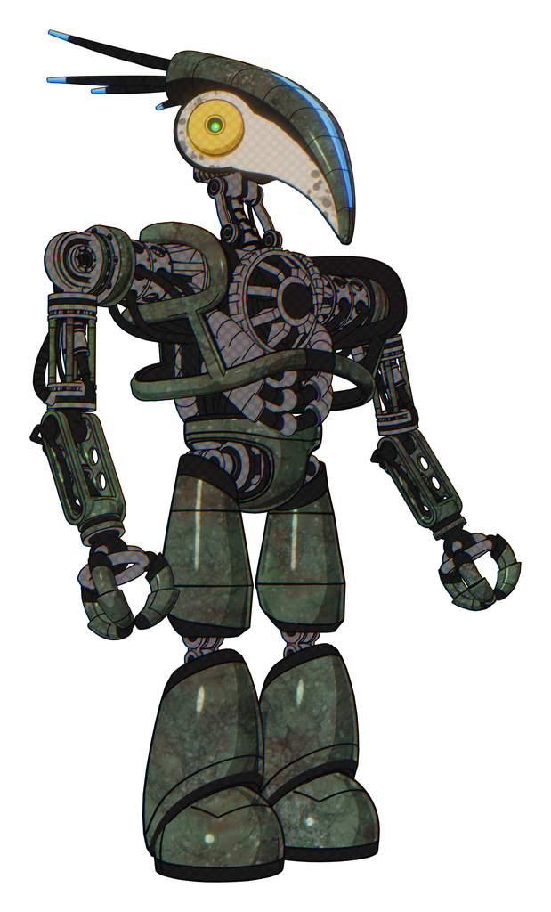 Robot containing bird skull head and brass steampunk eyes and head shield design and heavy upper chest and no chest plating and light leg exoshielding. Old corroded copper. Facing left view.