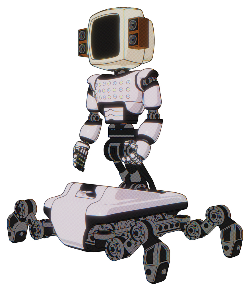 Mech containing old computer monitor and old retro speakers and light chest exoshielding and chest green blue lights array and insect walker legs. White halftone toon. Facing right view.