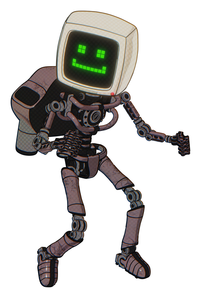 Robot containing old computer monitor and happy pixel face and light chest exoshielding and rocket pack and no chest plating and ultralight foot exosuit. Dusty rose red metal. Fight or defense pose..