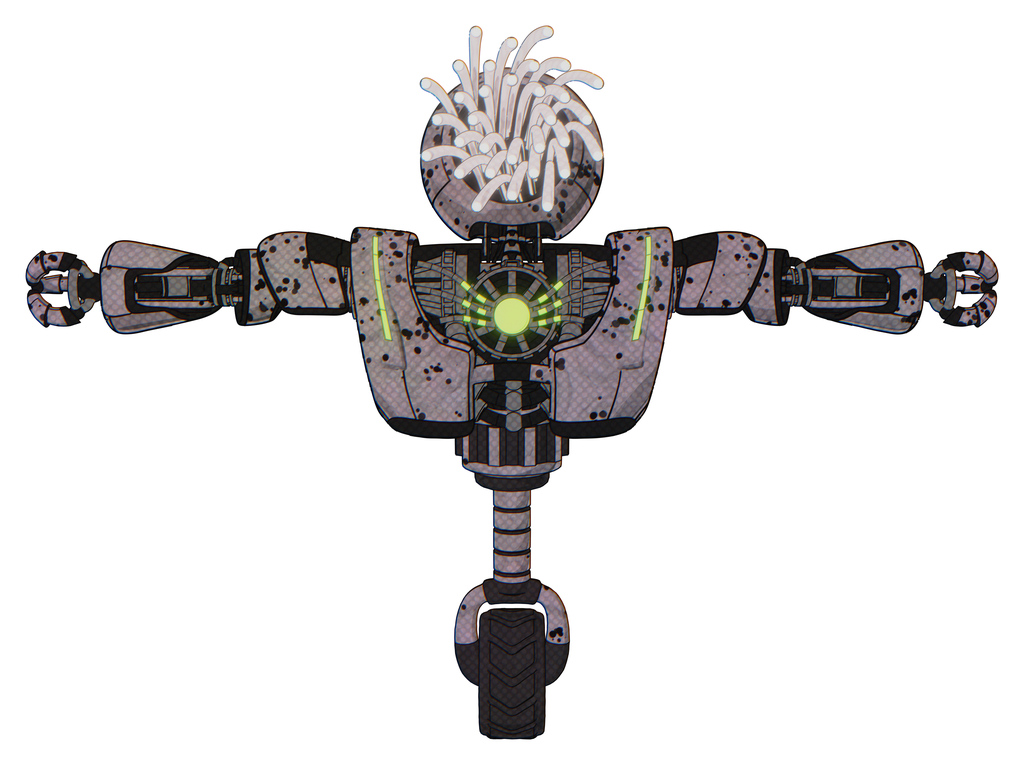 Mech containing round fiber optic connectors head and heavy upper chest and heavy mech chest and green energy core and unicycle wheel. Dark ink dots sketch. T-pose.