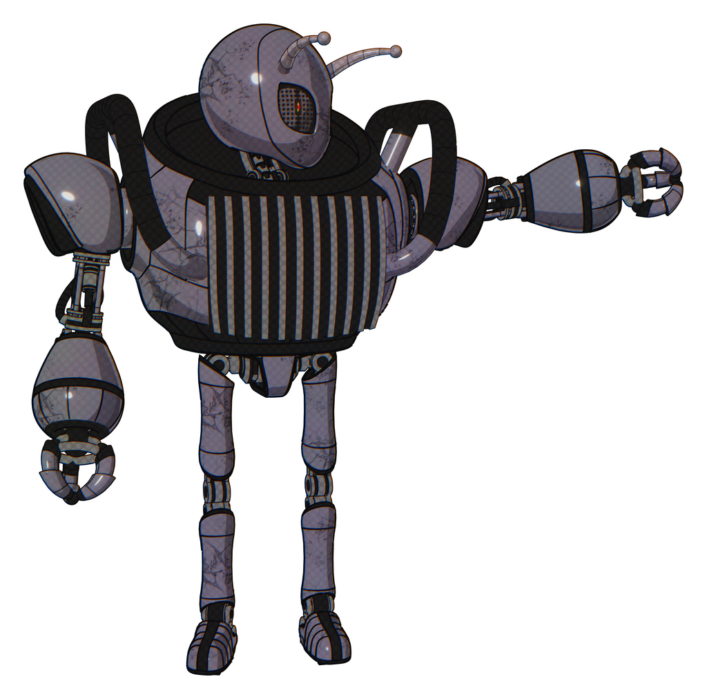Robot containing grey alien style head and metal grate eyes and bug antennas and heavy upper chest and chest vents and ultralight foot exosuit. Light lavender metal.