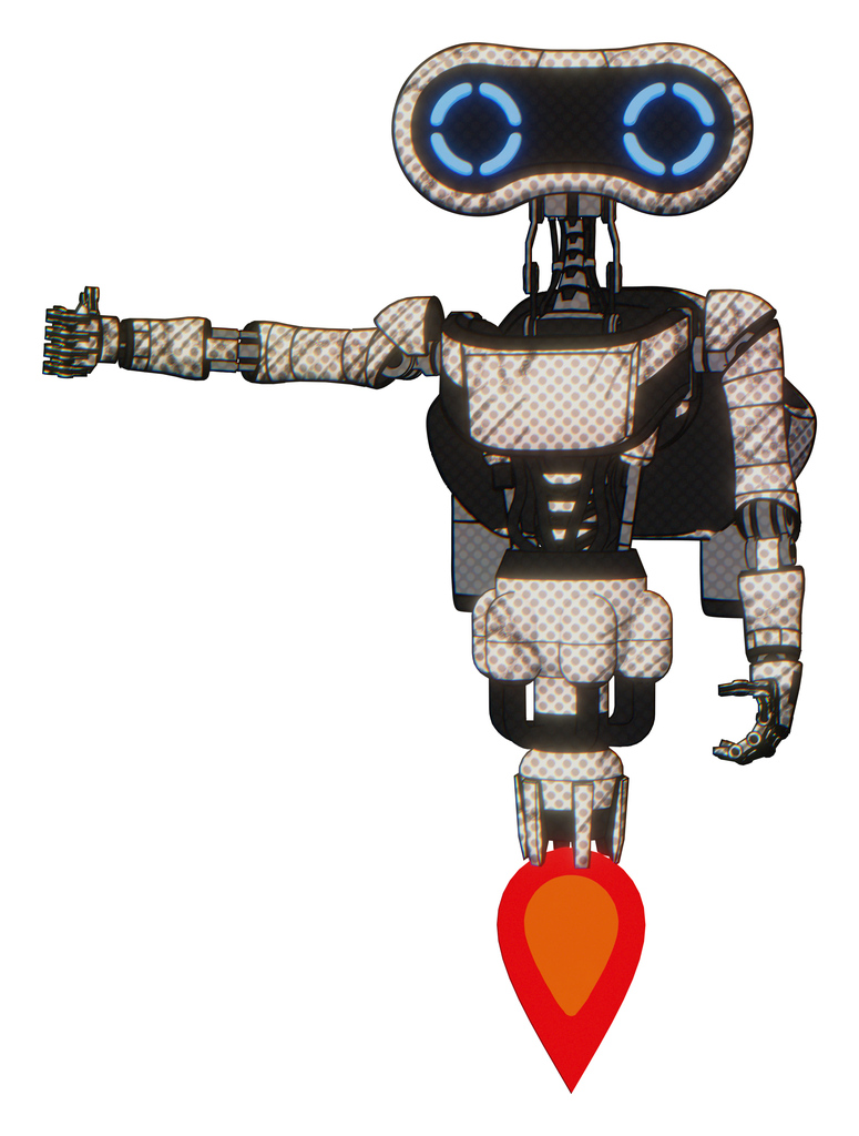 Cyborg containing dual retro camera head and retro 80's head and light chest exoshielding and ultralight chest exosuit and rocket pack and jet propulsion. Halftone sketch.