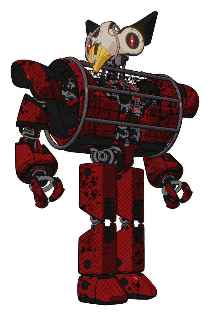 Droid containing elements: bird skull head, red line eyes, robobeak design, heavy upper chest, heavy mech chest, barbed wire chest armor cage, prototype exoplate legs. Material: Grunge dots dark red.