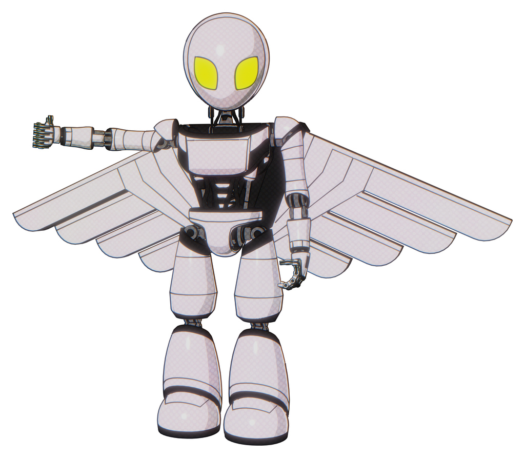 Bot containing grey alien style head and yellow eyes and light chest exoshielding and ultralight chest exosuit and pilot's wings assembly and light leg exoshielding. White halftone toon.