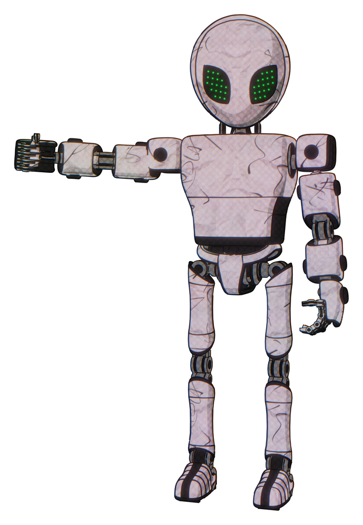 Robot containing grey alien style head and led array eyes and light chest exoshielding and prototype exoplate chest and ultralight foot exosuit. Sketch pad doodle lines.