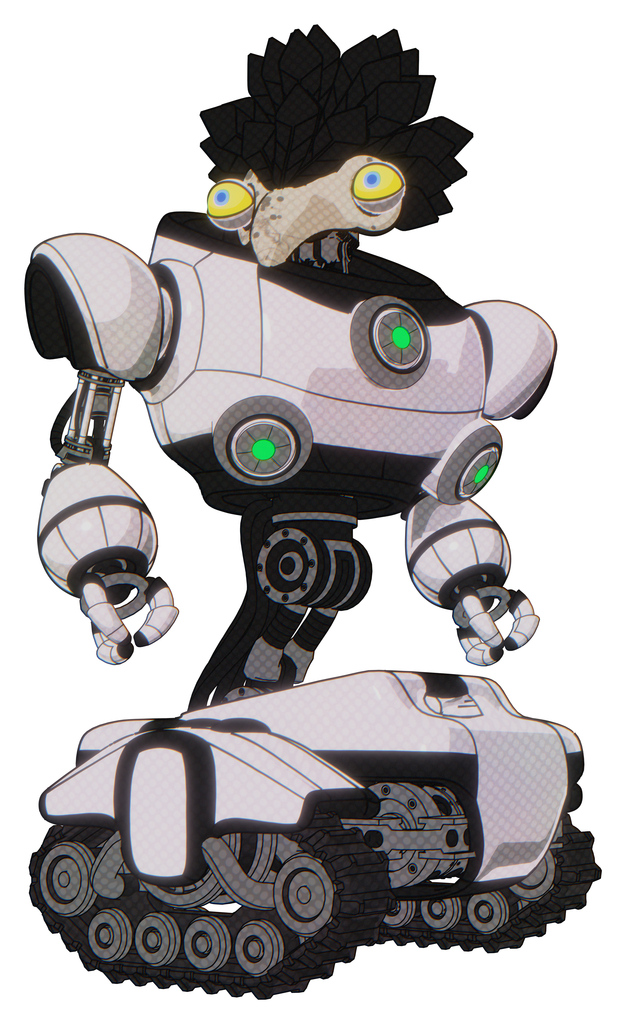 Bot containing bird skull head and big yellow eyes and crow feather design and heavy upper chest and chest green energy cores and tank tracks. White halftone toon. Hero pose.
