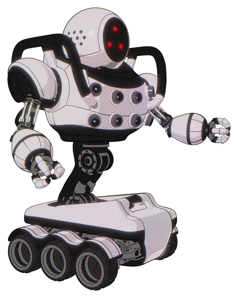 Automaton containing three led eyes round head and heavy upper chest and chest energy sockets and six-wheeler base. White halftone toon. Interacting.