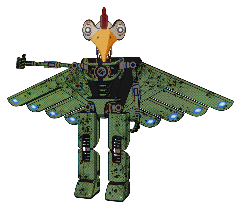 Robot containing elements: bird skull head, white eyeballs, chicken design, light chest exoshielding, cherub wings design, no chest plating, prototype exoplate legs. Material: Grunge grass green.
