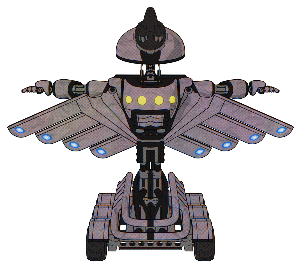 Bot containing gatling gun face design and light chest exoshielding and yellow chest lights and cherub wings design and six-wheeler base. Dark sketch. T-pose.