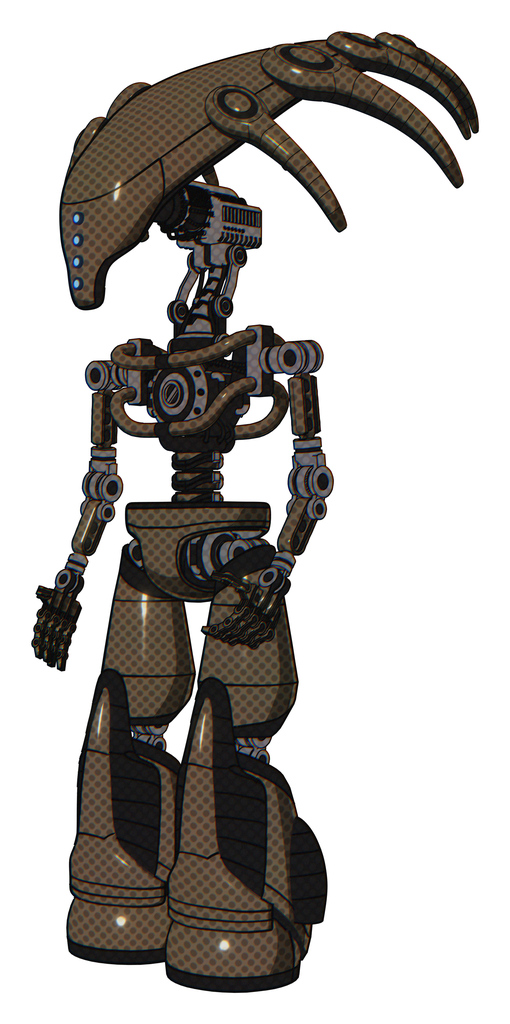 Bot containing flat elongated skull head and light chest exoshielding and no chest plating and light leg exoshielding and stomper foot mod. Light brown halftone. Facing right view.