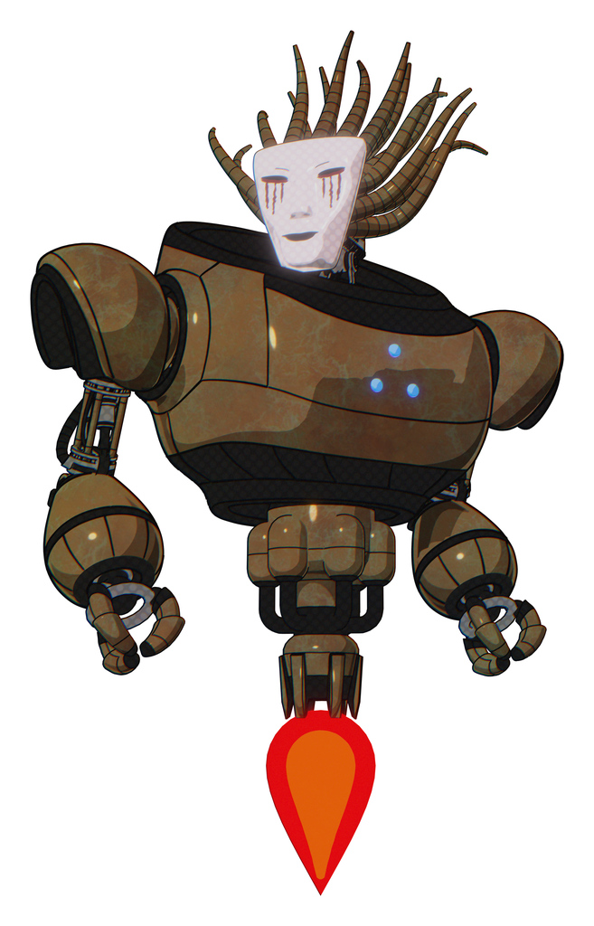 Robot containing humanoid face mask and blood tears and heavy upper chest and triangle of blue leds and jet propulsion. Old copper. Hero pose.