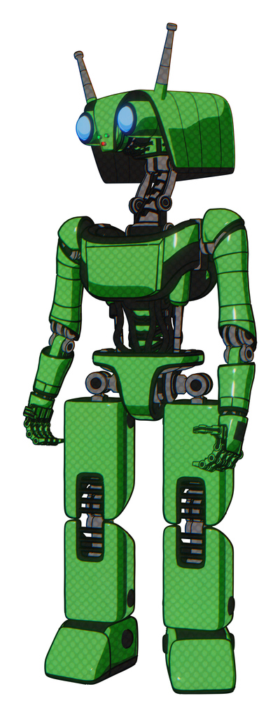 Droid containing dual retro camera head and cyborg antenna head and light chest exoshielding and ultralight chest exosuit and prototype exoplate legs. Secondary green halftone.