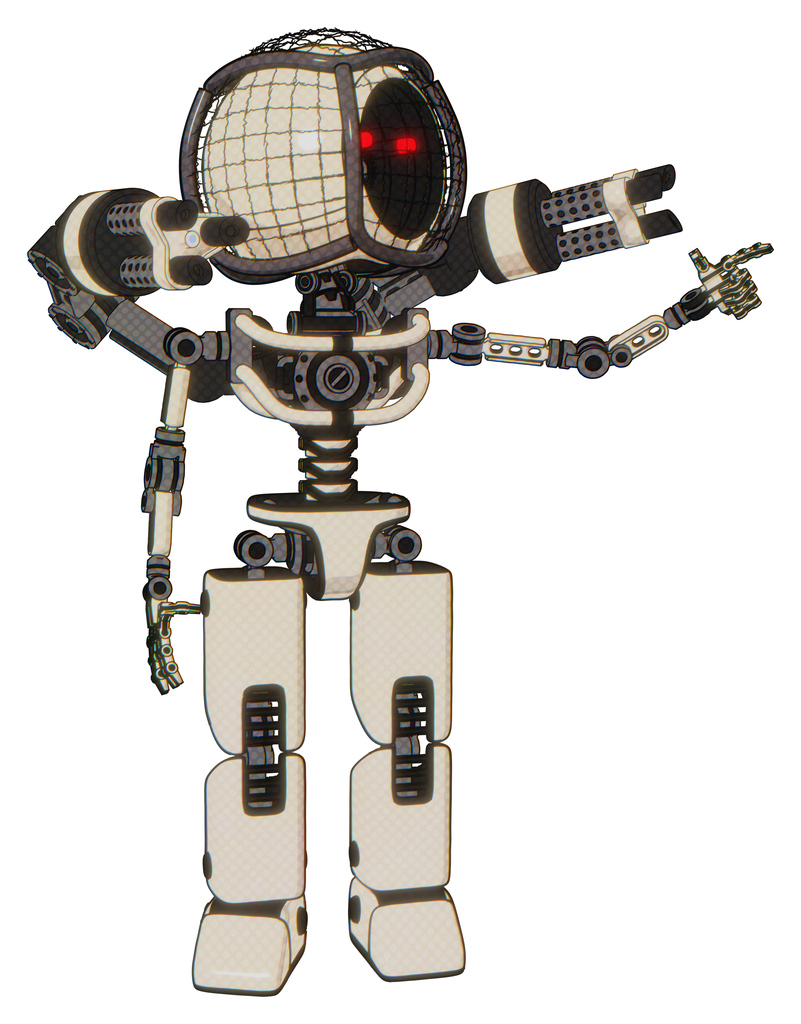 Robot containing round barbed wire round head and light chest exoshielding and minigun back assembly and no chest plating and prototype exoplate legs. Off white toon.