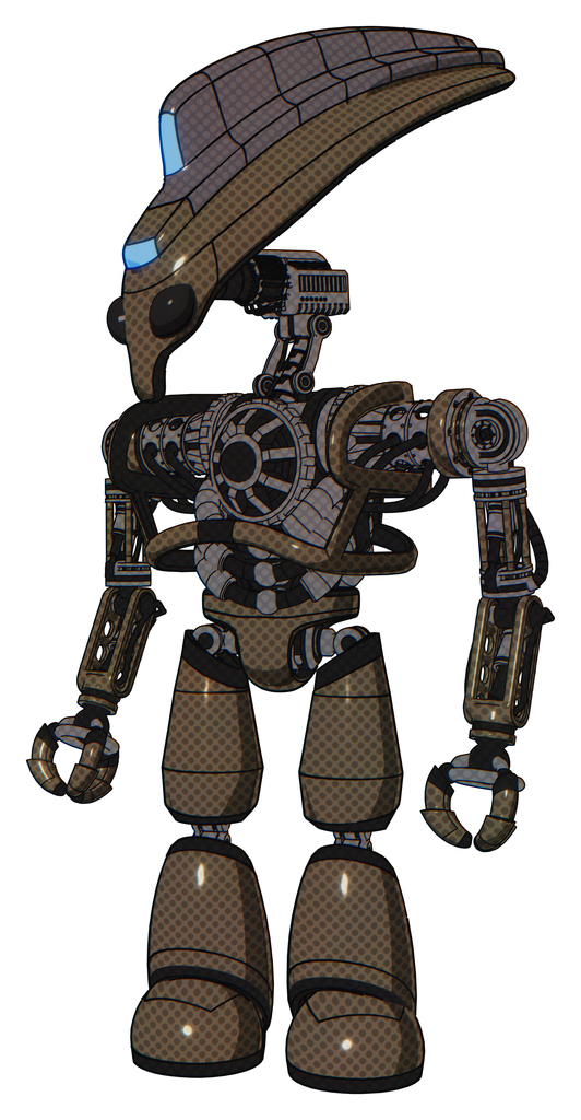 Droid containing flat elongated skull head and visor and heavy upper chest and no chest plating and light leg exoshielding. Light brown halftone. Standing looking right restful pose.
