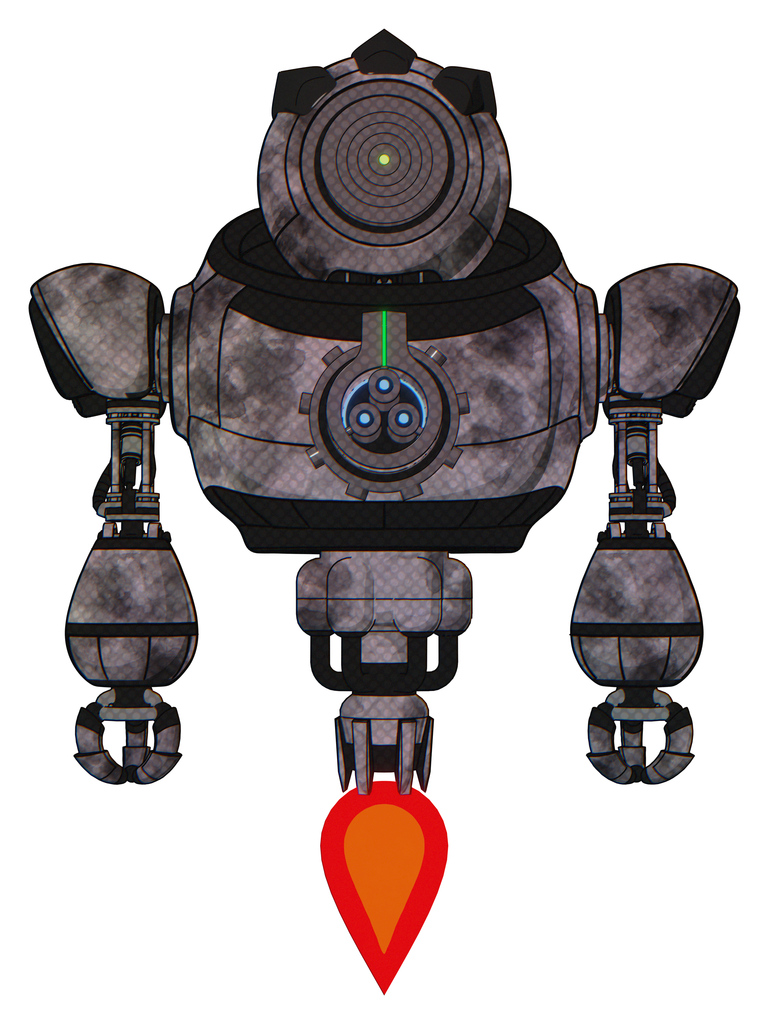 Automaton containing green dot eye corn row plastic hair and heavy upper chest and chest energy gun and jet propulsion. Sketch pad cloudy smudges. Front view.