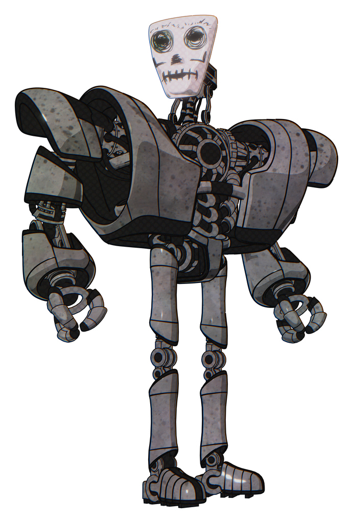 Cyborg containing humanoid face mask and skeleton war paint and heavy upper chest and heavy mech chest and ultralight foot exosuit. Unpainted metal. Hero pose.