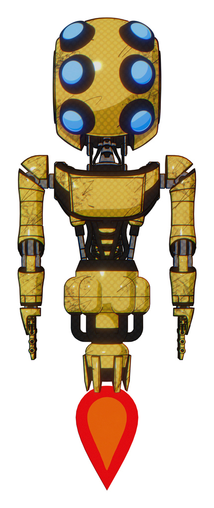 Droid containing round head and six eye array and bug eyes and light chest exoshielding and ultralight chest exosuit and jet propulsion. Construction yellow halftone. Front view.