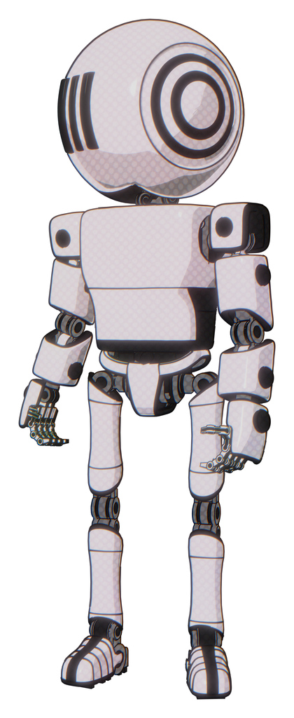 Bot containing round head and three lens sentinel visor and light chest exoshielding and prototype exoplate chest and ultralight foot exosuit. White halftone toon. Standing looking right restful pose.