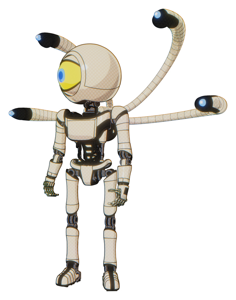 Cyborg containing giant eyeball head design and light chest exoshielding and ultralight chest exosuit and blue-eye cam cable tentacles and ultralight foot exosuit. Off white toon.